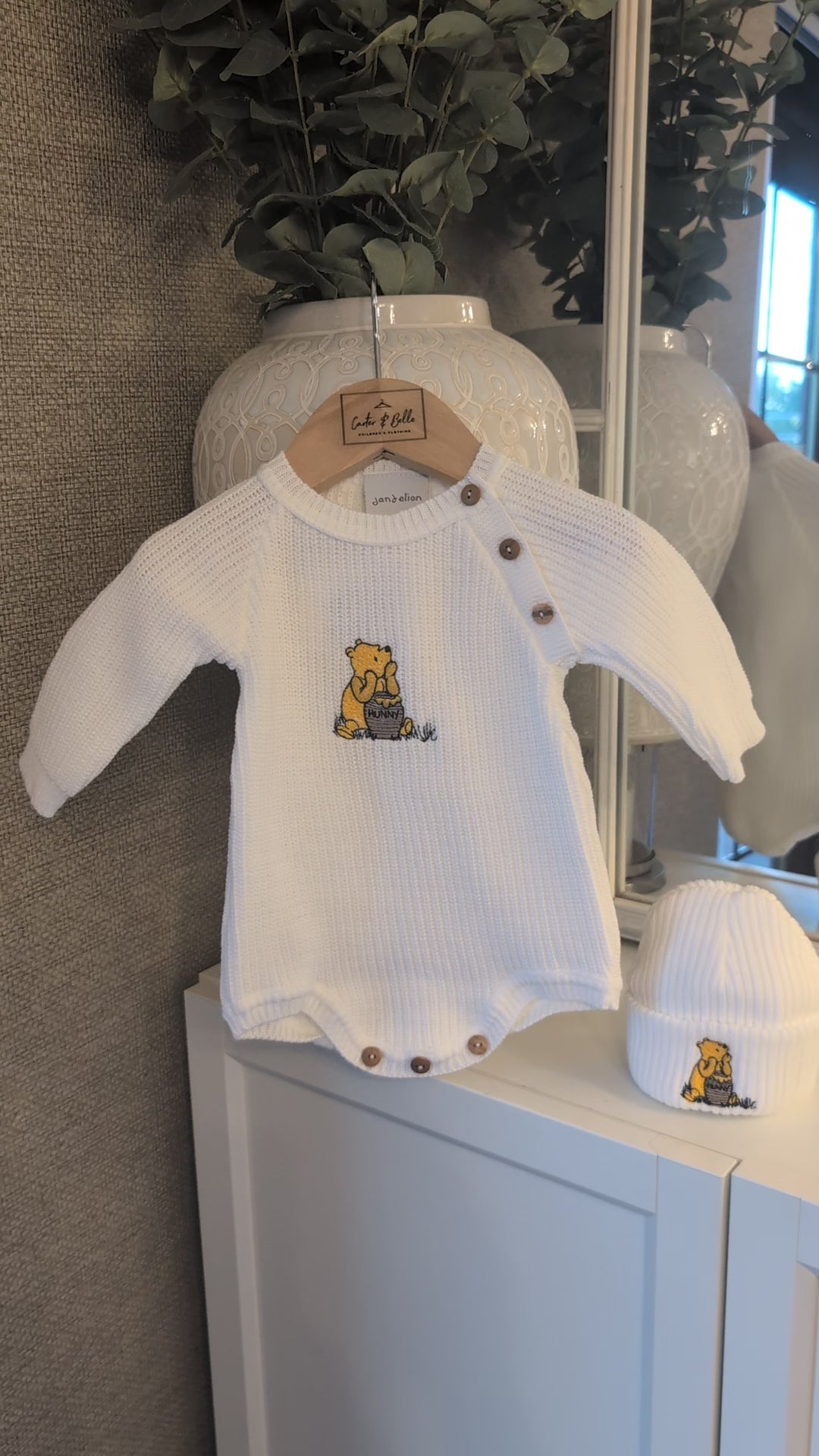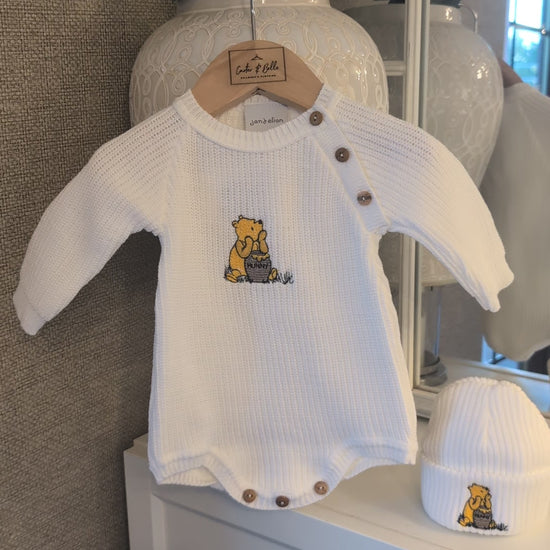 Our gorgeous knitted romper, embroidered with our popular honeybear design on the front, and comes with matching kitted hat.